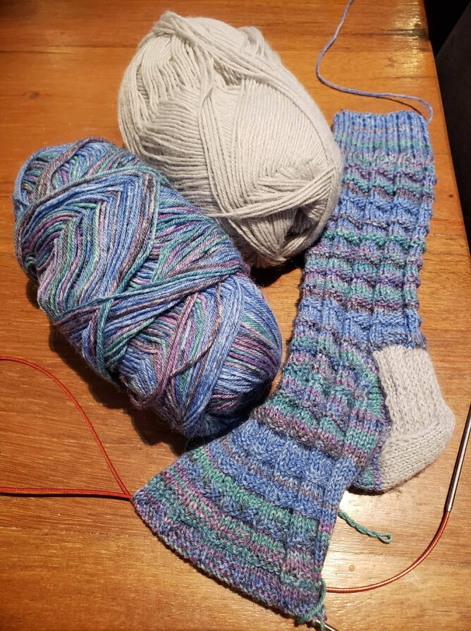 I am sure there will be time to finish off these gorgeous socks (see picture). It has a heel flap and gusset and is knitted from the top down. The pattern is available from Anna Knitter Yarns and is her Helgen Socks knitting pattern. I'm loving the texture of the fabric. The contrasting heel and toe is in "Dusty Miller" from the West Yorkshire Spinners Florist Collection. The 25% nylon content makes them so durable.