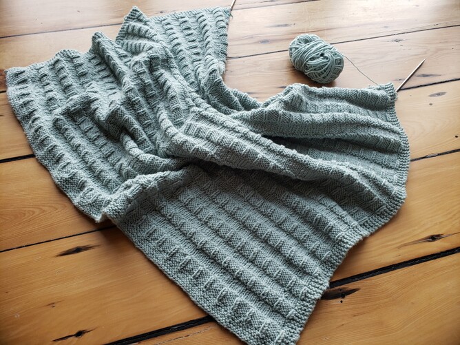 This is a modification of the shawl pattern by Fifty Four Ten Studio, called "Room with a View". The knits and purls create window-like patterns in the fabric, which is a very simple and yet appealing design (especially when you use a yarn with good stitch definition). There is a proper blanket version of this pattern called "The Days to Come", but I already had the shawl version in my library, and it's easy to modify. DMC's yarn "Woolly Merino" is the perfect yarn to use, for it is incredibly soft, has fantastic stitch definition, and is machine washable, too! If you love to knit blankets, you should check out the many patterns published by Fifty Four Ten Studio on their website.
