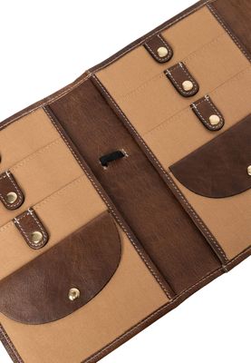 PROJECT 14 is our XL needle case for organizing your interchangeable circular knitting needles. It features 6 pockets with snap closures to securely hold your wires. Behind these pockets, there are open compartments where you can store knitting patterns or similar items. An elastic band allows you to keep your measuring tape handy, and there are 6 holes in the leather to accommodate 3 needles. A total of 18 slim pockets for knitting tips, crochet hooks of stocking needles, keeps them organized. Finally, you have 2 small pockets with flap and button closure where you can store your scissor and other loose knitting accessories. The entire needle case elegantly folds together and fastens with a snap, making it easy to carry your essential knitting tools.